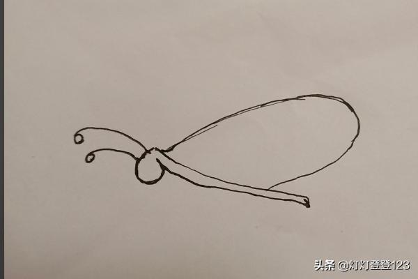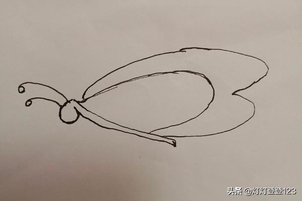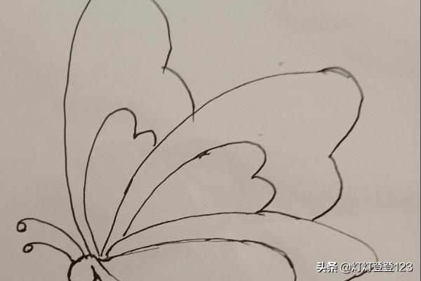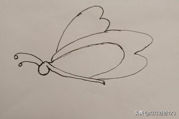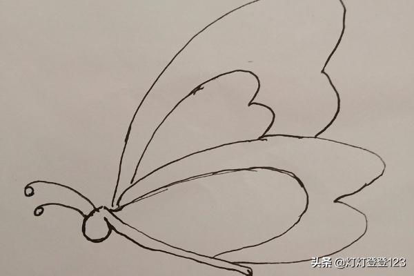 第三步,画蝴蝶的翅膀,从头部往尾部画弧线,先画里层后画外层圆弧。飞舞的翅膀是往后飞扬的。