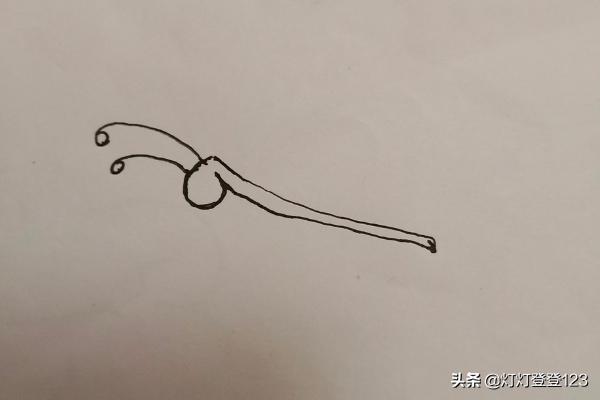 第二步,画蝴蝶的身子,我们画的是蝴蝶飞舞状态,身子稍微向下倾斜,隐隐有向上飞的姿势。
