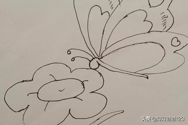 第六步,有蝴蝶怎么会少花香呢,我们在蝴蝶旁边画一朵芳香的花,整个画面就和谐唯美了。最后给画面涂上美丽的色彩吧。