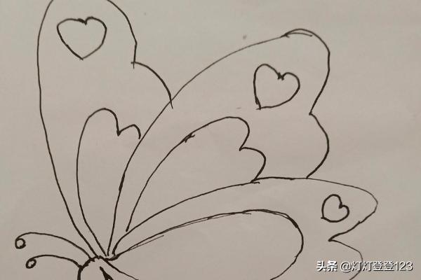 第五步,给蝴蝶画上美丽的纹路,这里小编添加爱心形状的纹路。涂上颜色后色彩斑斓。一只翩翩起舞的蝴蝶就画好了。