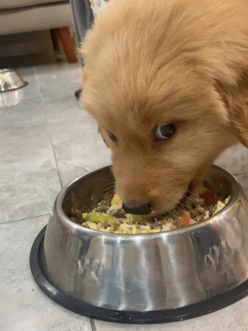 要定点喂食,注意将狗粮泡软后喂食给金毛,少食多餐科学饲喂,切忌暴饮暴食。
