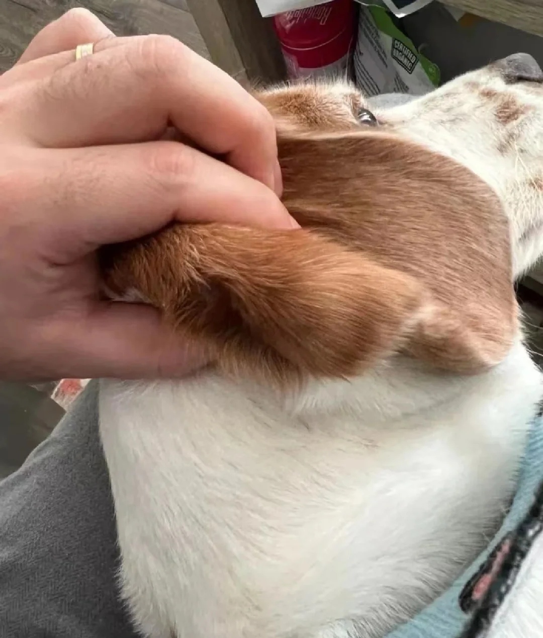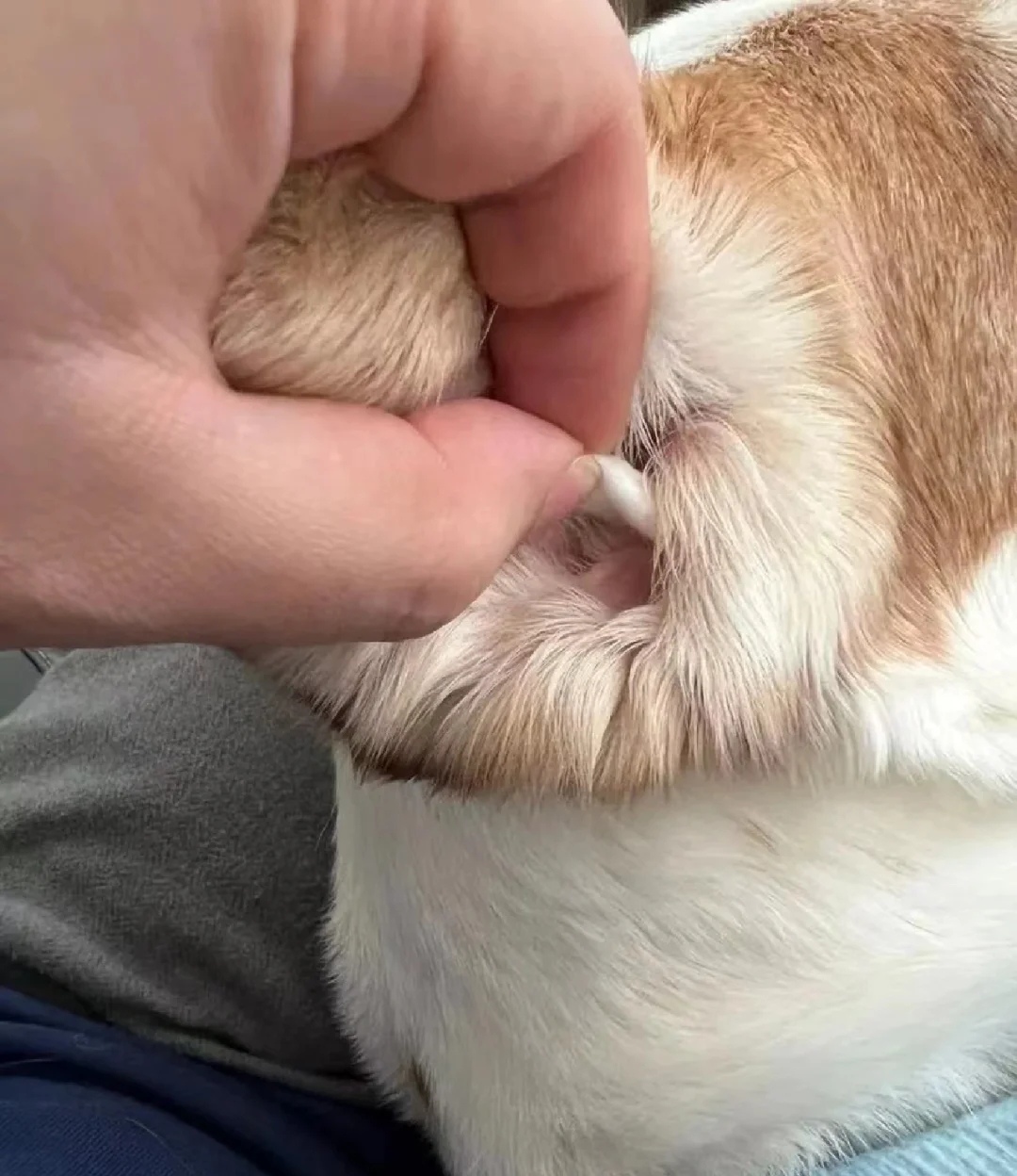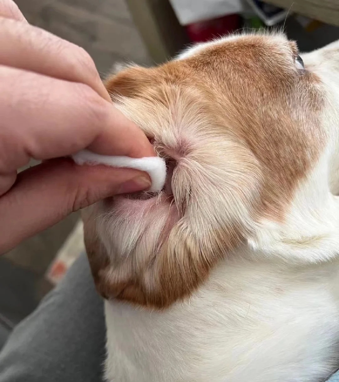 用湿巾蘸取滴耳液轻轻擦拭狗狗耳朵内部