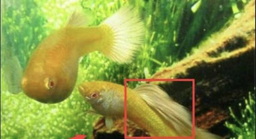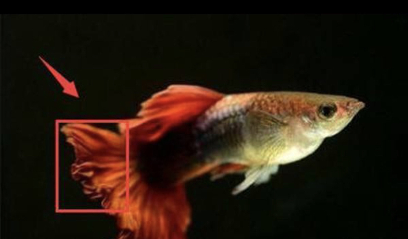 其次症状是尾鳍末端呈不规则、溃烂,并有出血,尾鳍紧缩。如下图所示: