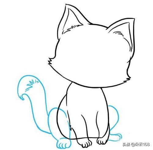 7.接下来,画出小猫的后腿。使用长而曲线的线条来包围腿部的圆形形状。然后,使用“U”形线条形成脚趾,包围脚。注意曲线表示其中一个脚的折痕。然后,画出尾巴。从后腿后面伸出两条长而弯曲的线条。使用一系列连接的短线在末端指示不同颜色的簇。