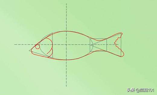 1.画十字形辅助线让形状排成直线。画椭圆形及长方形辅助线当鱼身。