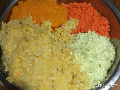 3、红薯土豆南瓜切成小片,上锅蒸,我蒸了20分钟(看大家切的多大了)能用筷子扎烂就好,晾凉后和胡萝卜一起,捣面糊状或搅拌机搅拌成泥,菜就准备好了。