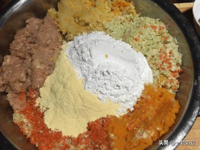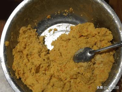 6、加入小麦面粉和玉米粉和鸡蛋黄,这里要说不需要水,菜里面的水就足够,如果稀的话就加玉米粉和小麦粉,倒入3勺橄榄油,搅拌均匀,我直接下手抓的 。